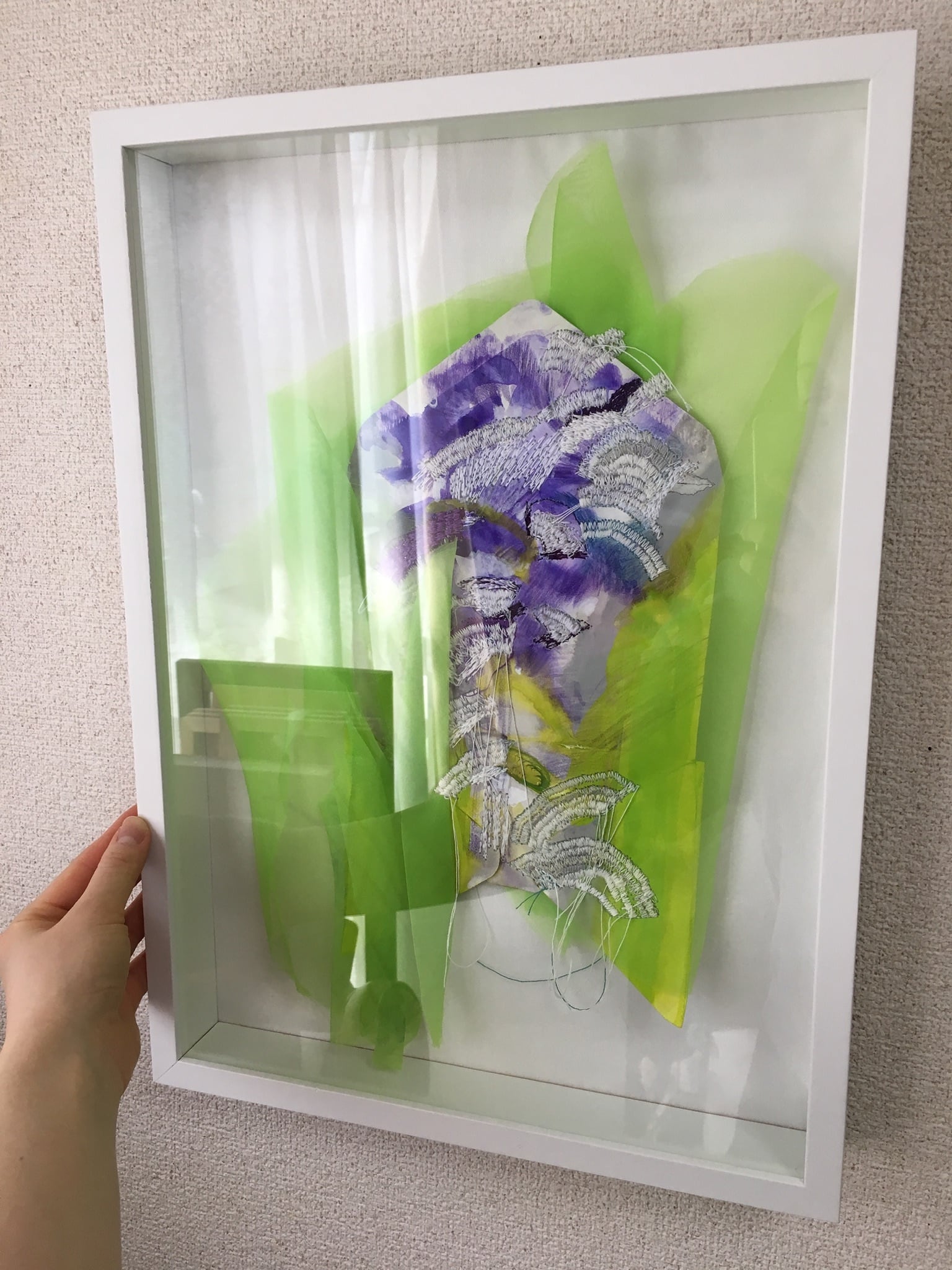 技法:封筒と布にドローイング(アクリル絵具)と刺繍