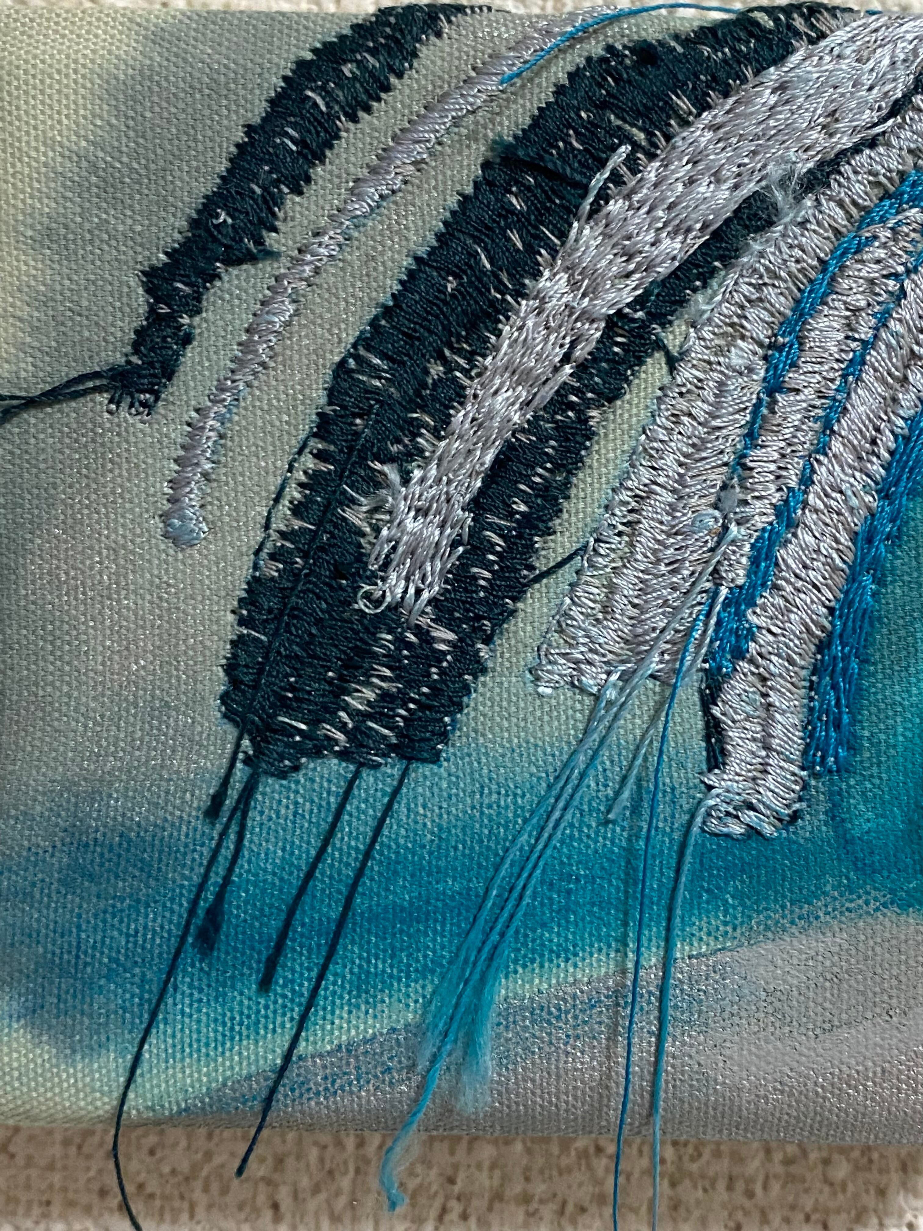 技法: 木製パネルに布張り, アクリル絵具とジェッソでドローイング,刺繍