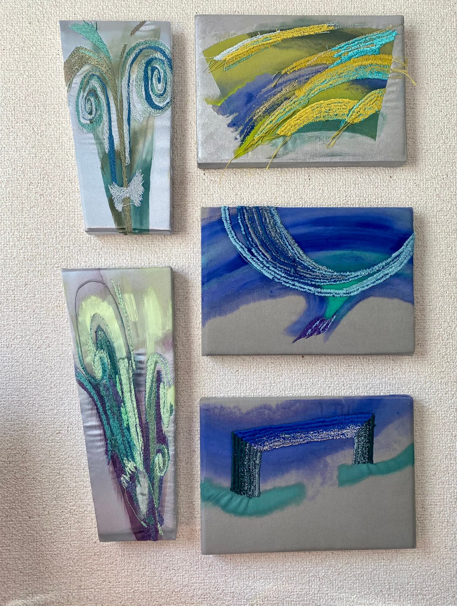 技法: 木製パネルに布張り, アクリル絵具, ジェッソ, 刺繍