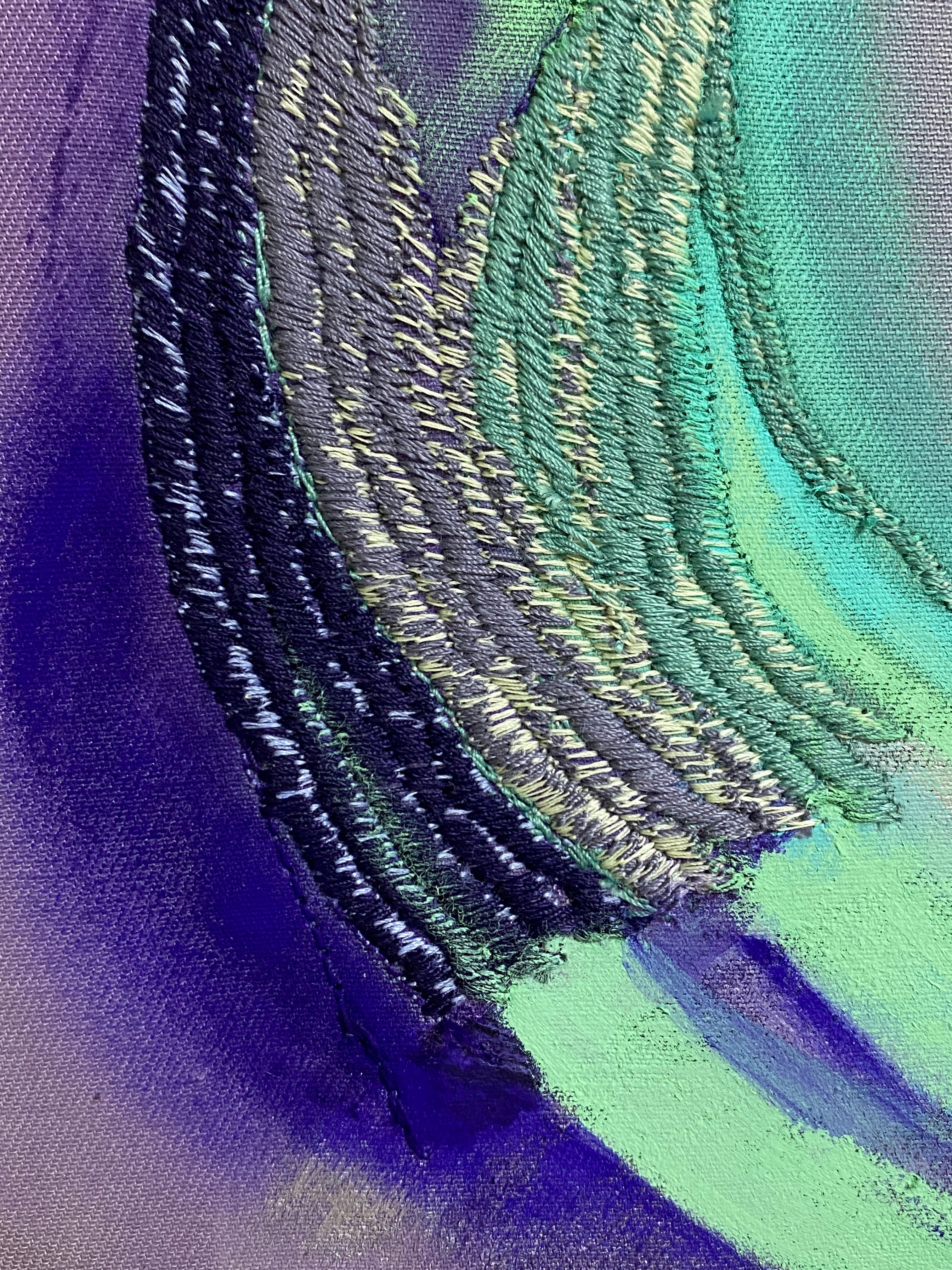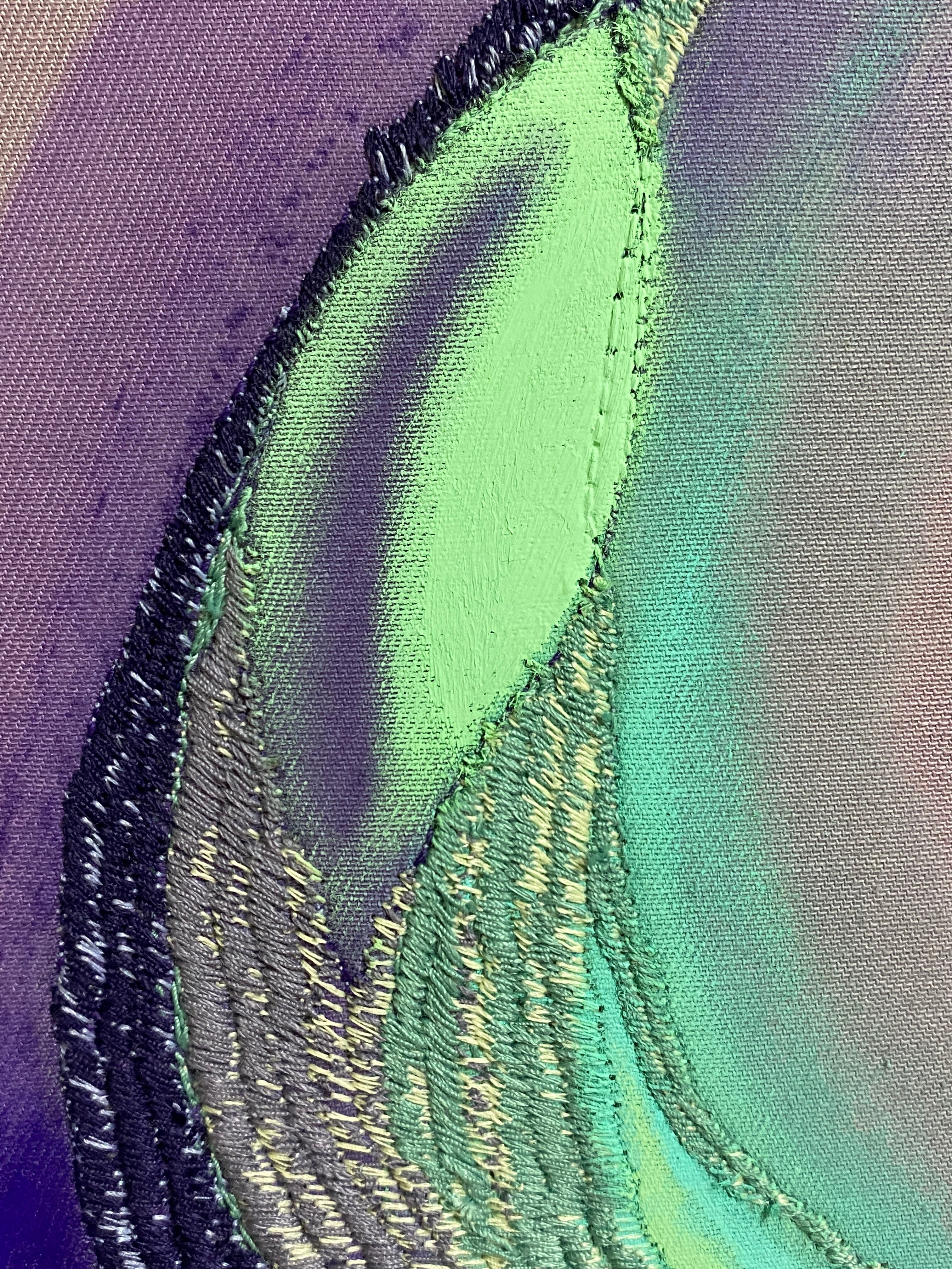 技法: 木製パネルに布張り, アクリル絵の具, ジェッソ, 刺繍 , ボタン